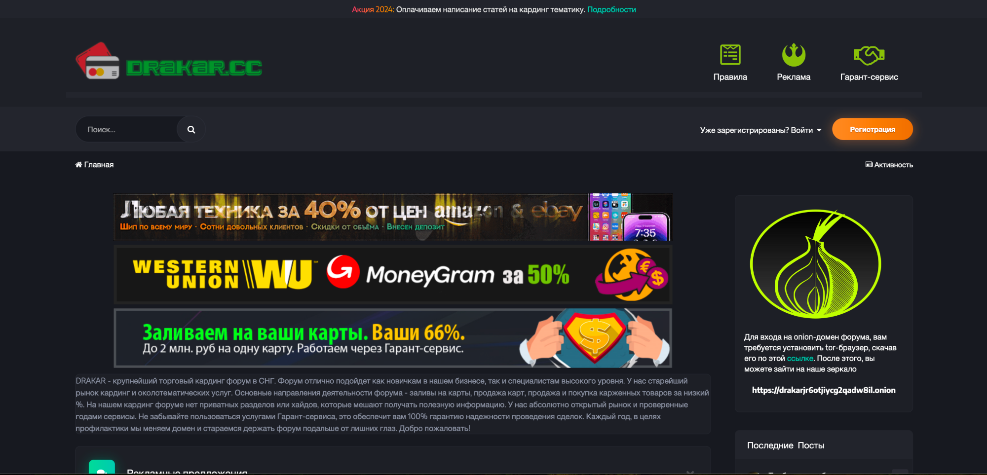 DRAKAR — крупнейший в даркнете торговый кардинг форум в СНГ. Форум отлично подойдет как новичкам в бизнесе, так и специалистам высокого уровня. На форуме действует Гарант-сервис, это обеспечит вам 100% гарантию надежности проведения сделок.